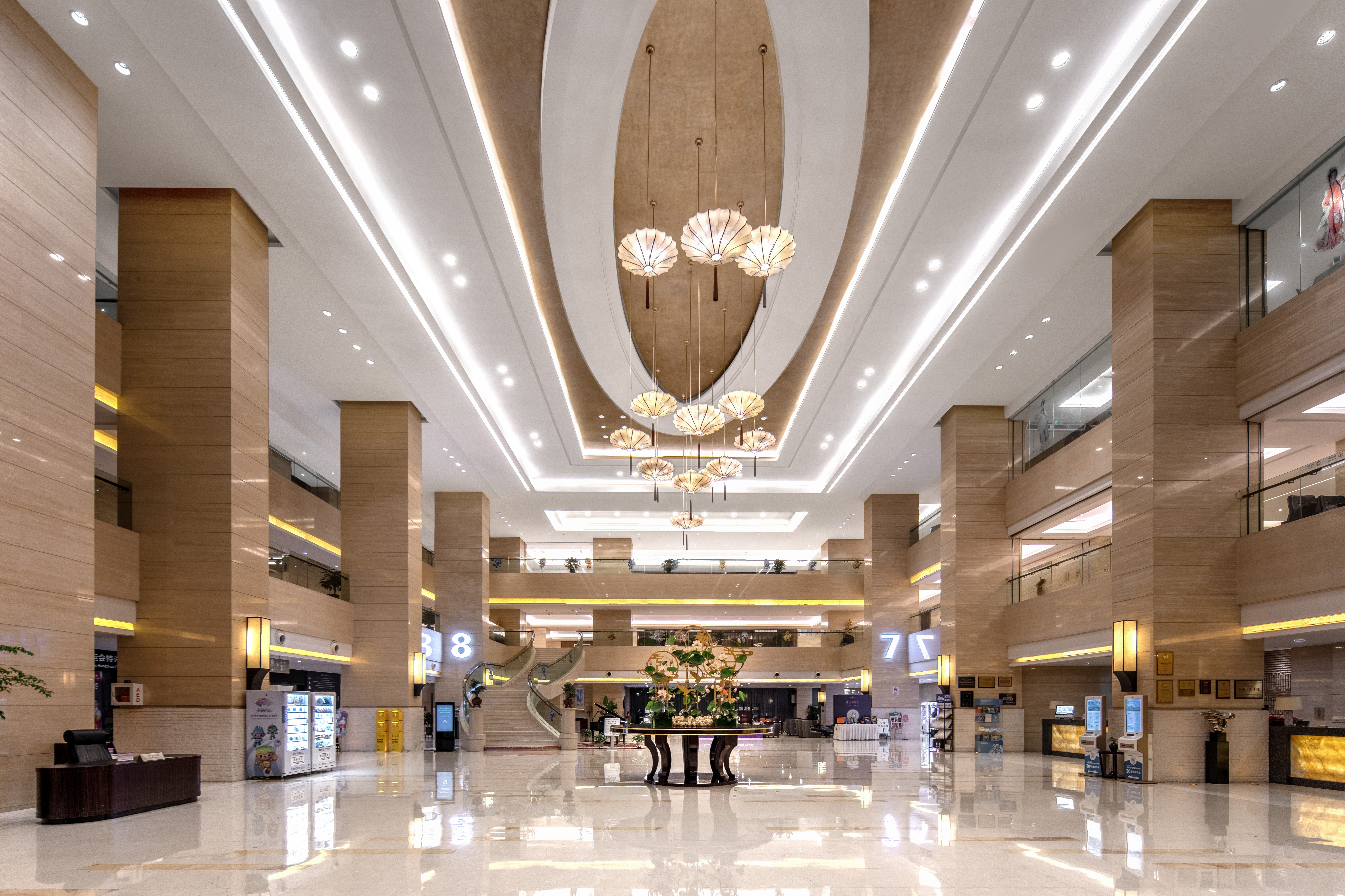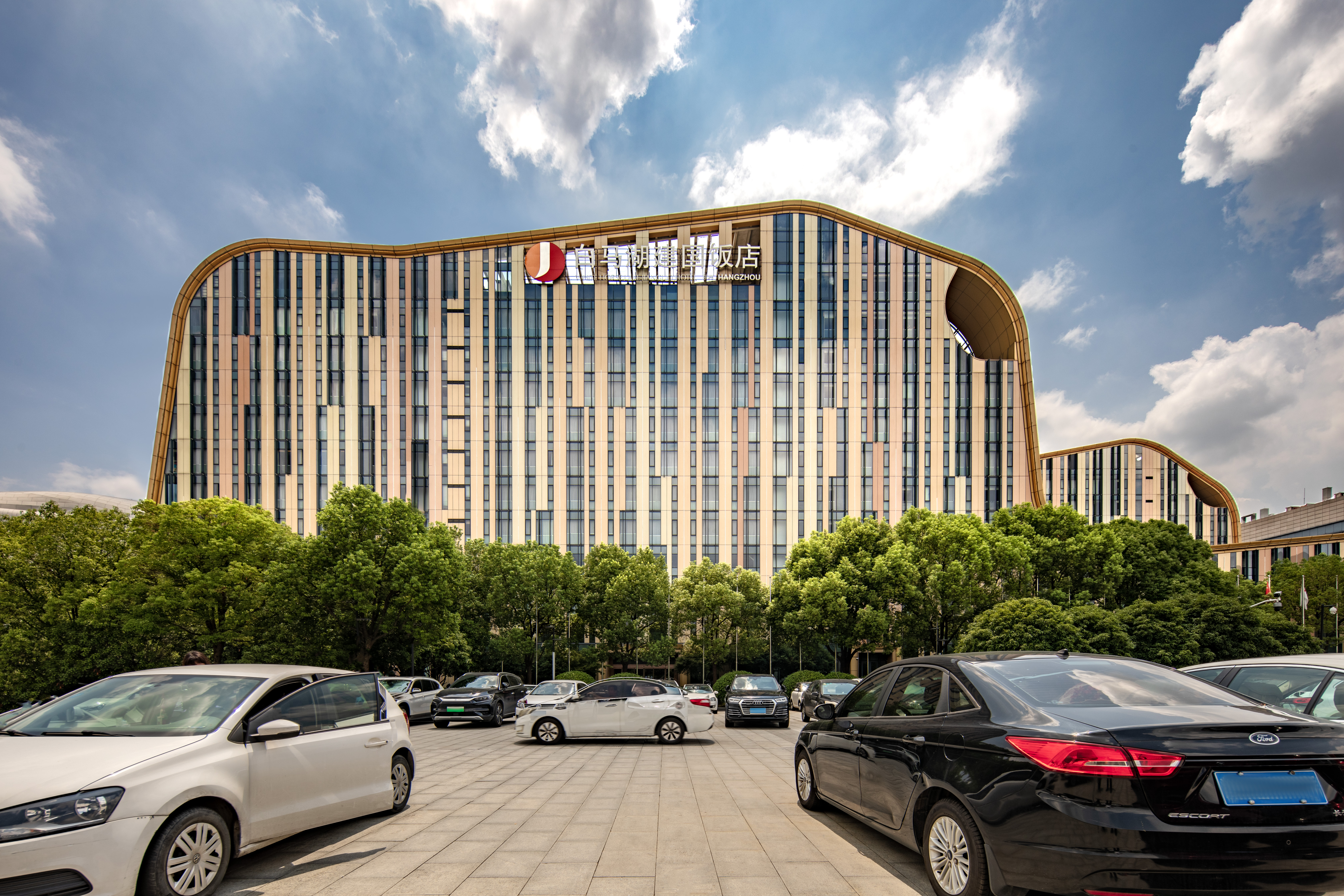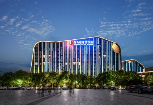 Located in Hangzhou's Binjiang area near White Horse Lake Convention & Exhibition Center, the White Horse Lake Jianguo Hotel (Baimahu Jianguo Fandian) is a 10 minute drive to West Lake, Hangzhou CBD, and Hangzhou Train Station. It is 30 minutes' drive to Xiaoshan International Airport. The White Horse Lake Jianguo Hotel's unusual exterior features organic curves and a striated front that from a distance is reminiscent of the bark of a tree, rising up from the flat green lawns that surround it. Each of the hotel's 382 rooms and suites feature stylish contemporary décor, flat screen TVs with a wide variety of local and international news and entertainment, and unlimited complimentary Internet. Two on-site restaurants, a café, lounge and lobby bar provide ample range of drinking and dining options with award-winning Cantonese cuisine served in the Golden Phoenix, southeast Asian delicacies in Chichi and global favorites in the Victory Café. Room service is available 24 hours a day.Business travelers and event planners can make use of the expansive ballroom and 23 well-equipped meeting rooms.